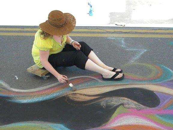 Some of her work can be found in murals in and around Elmira, Ny. Other work in the illustrations of children’s books, and even more on canvas in homes and businesses. Most often, she works with acrylic, oil, and watercolor, but can be found every year at the Elmira Street Painting festival; covered in chalk.